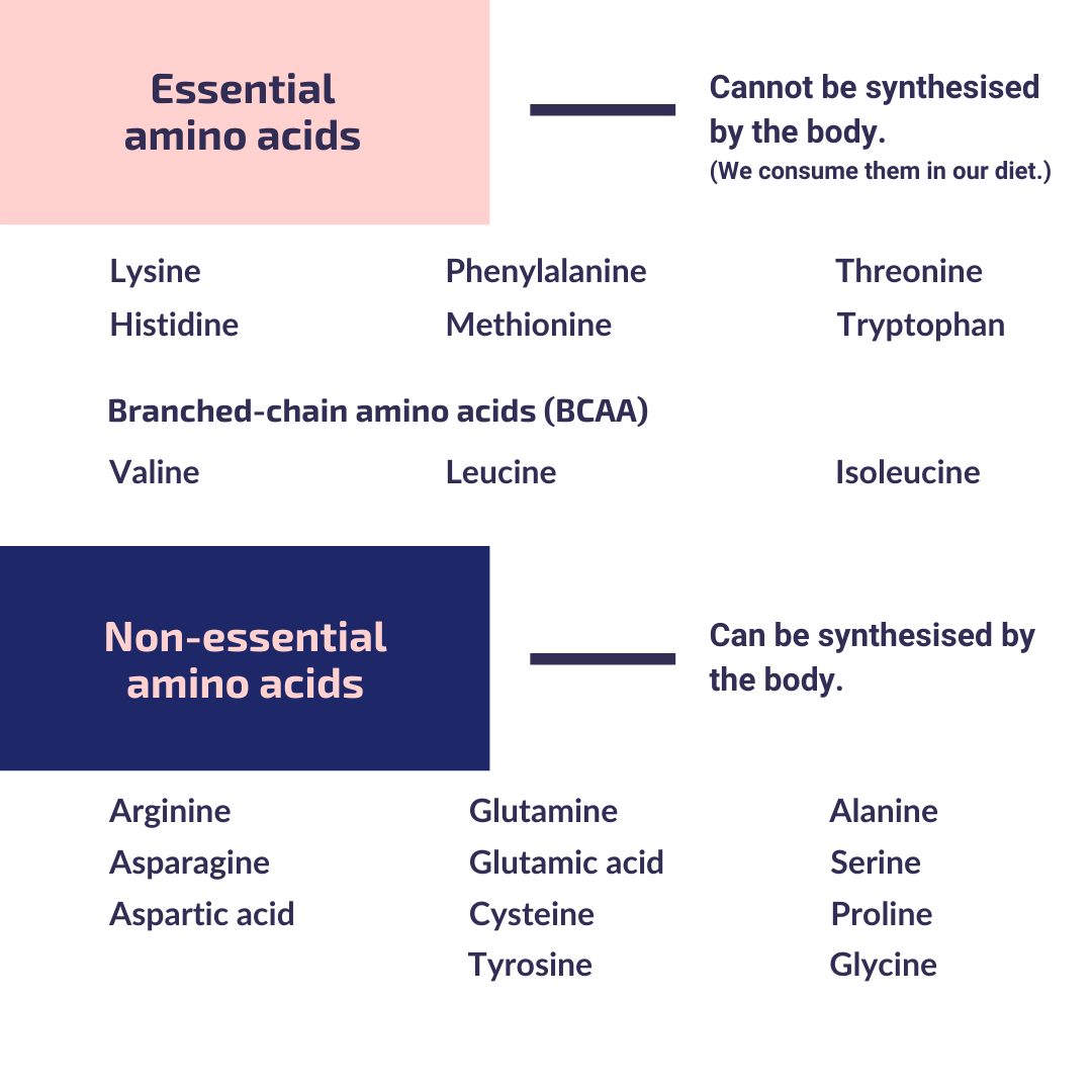 There are 20 different amino acids, all of which play an important role in our bodies. 11 of them can be found in our diets and can be made by our bodies. These are called non-essential amino acids (NEAAs) because you don’t need to get them from external sources.